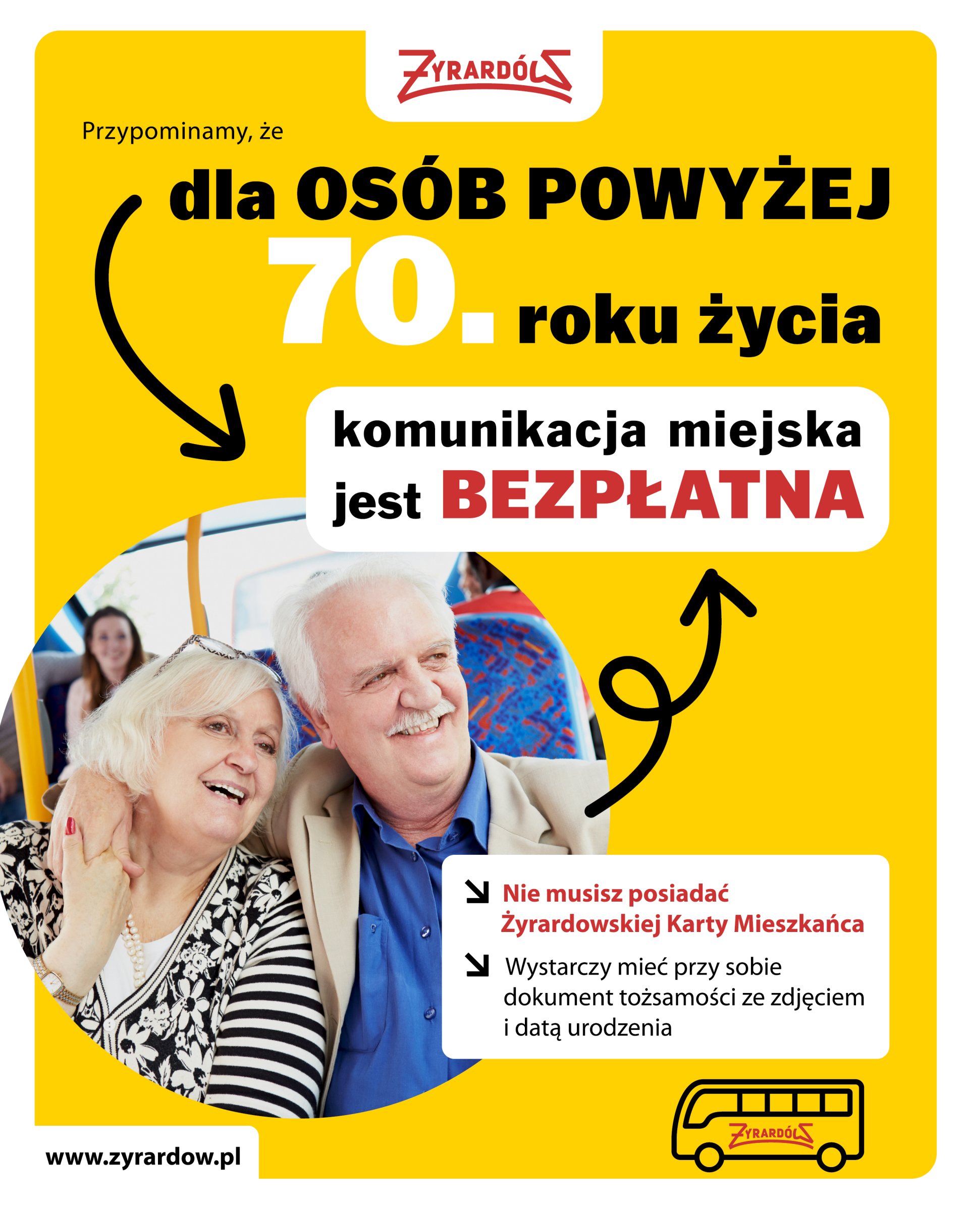Seniorze! Osoby, które ukończyły 70 lat, mają prawo do bezpłatnych przejazdów komunikacją miejską w Żyrardowie bez konieczności posiadania Żyrardowskiej Karty Mieszkańca. Sam wiek uprawnia do korzystania z tego przywileju. Nie ma potrzeby składania wniosku o wydanie karty w Urzędzie Miasta.