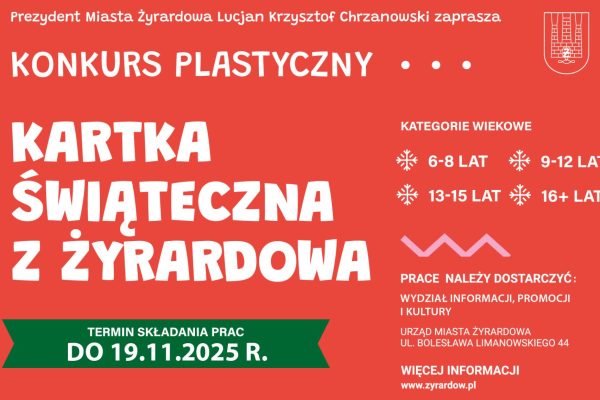 Prezydent Miasta Żyrardowa Lucjan Krzysztof Chrzanowski zaprasza do udziału w konkursie plastycznym ,,Kartka świąteczna z Żyrardowa”. Konkurs kierowany jest do dzieci (od 6 lat), młodzieży i dorosłych, zamieszkałych w Żyrardowie.