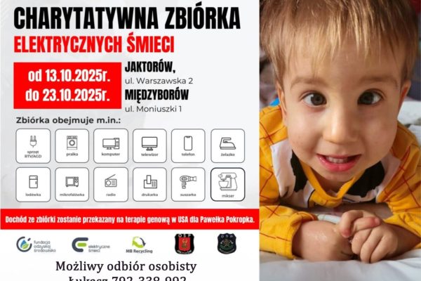 Od 13 do 23 października oddaj zużyty sprzęt elektroniczny w Jaktorowie lub Międzyborowie i wesprzyj dwuletniego Pawełka Pokropka w walce z chorobą. Każdy elektrośmieć ma moc pomagania! Nie możesz własnoręcznie…