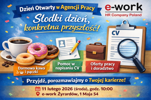 Agencja pracy e-Work z siedzibą w Żyrardowie przy ul. 1 Maja 54 zaprasza na dzień otwarty, podczas którego mieszkańcy będą mogli skorzystać z profesjonalnego doradztwa w napisaniu CV oraz wsparcia…