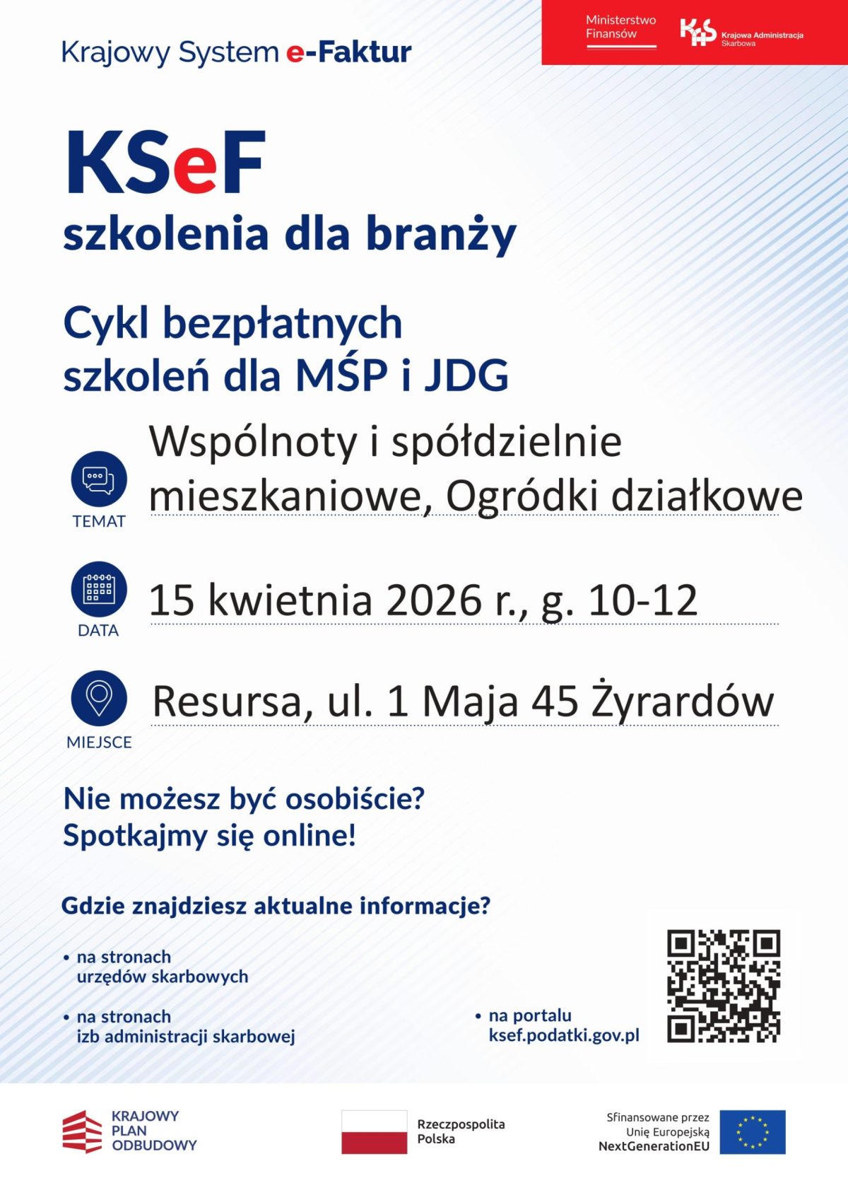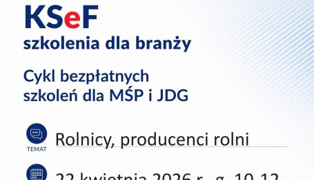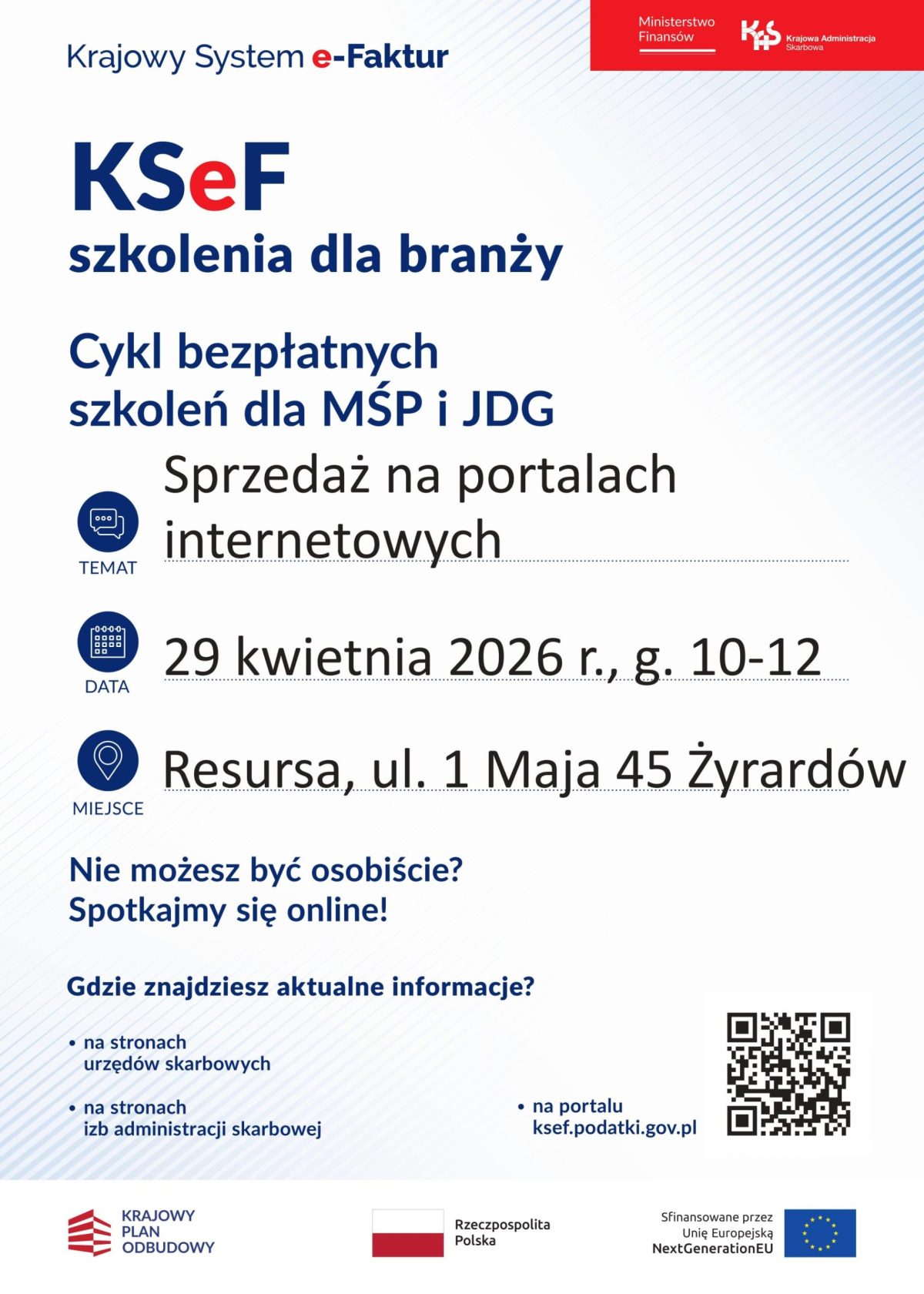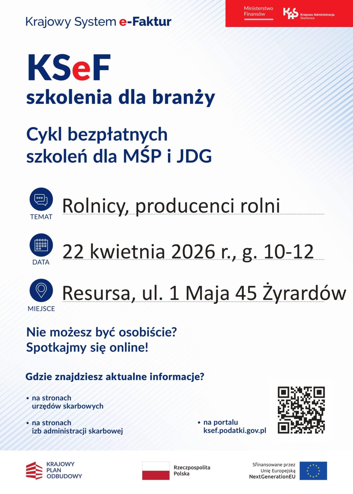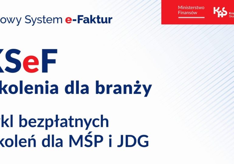 Urząd Skarbowy w Żyrardowie zaprasza na cykl bezpłatnych szkoleń dla MŚP i JDG ,,KSeF szkolenia dla branży”. Szkolenia odbędą się 8, 15, 22 i 29 kwietnia 2026 roku w Resursie w Żyrardowie. Zapraszamy!