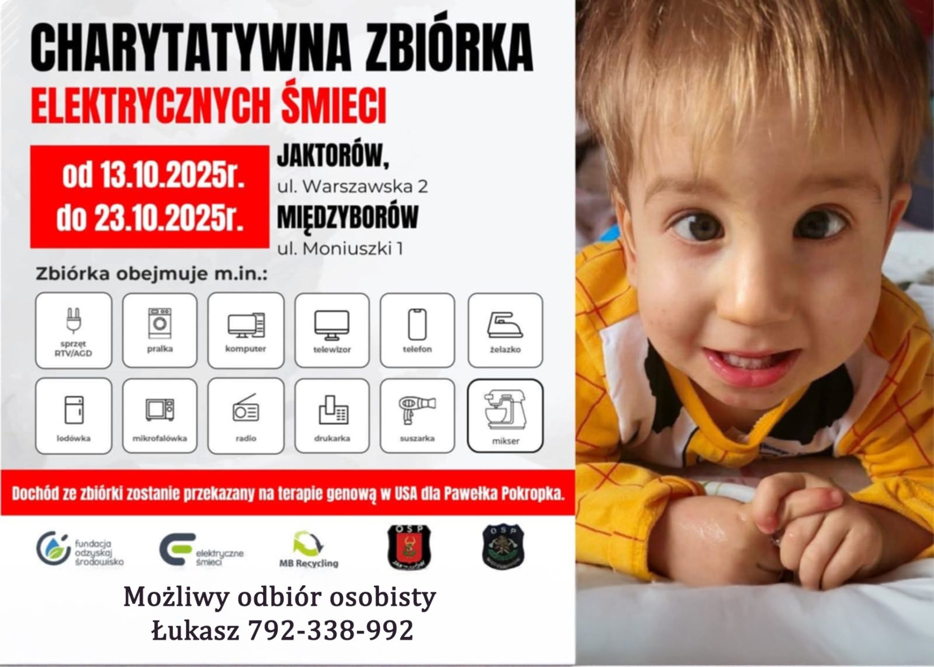 Od 13 do 23 października oddaj zużyty sprzęt elektroniczny w Jaktorowie lub Międzyborowie i wesprzyj dwuletniego Pawełka Pokropka w walce z chorobą. Każdy elektrośmieć ma moc pomagania!