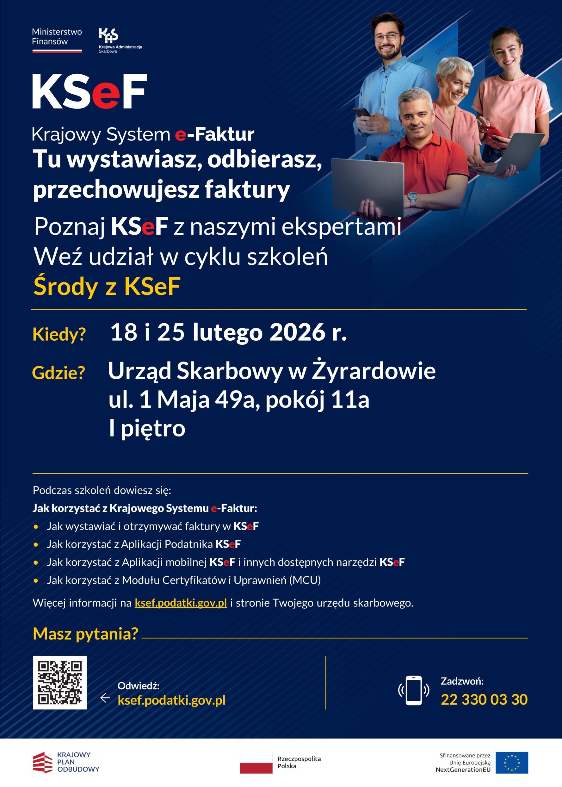 Urząd Skarbowy w Żyrardowie kontynuuje cykl spotkań informacyjnych „Środy z KSeF”. Zapraszamy do udziału w kolejnych szkoleniach poświęconych Krajowemu Systemowi e-Faktur.