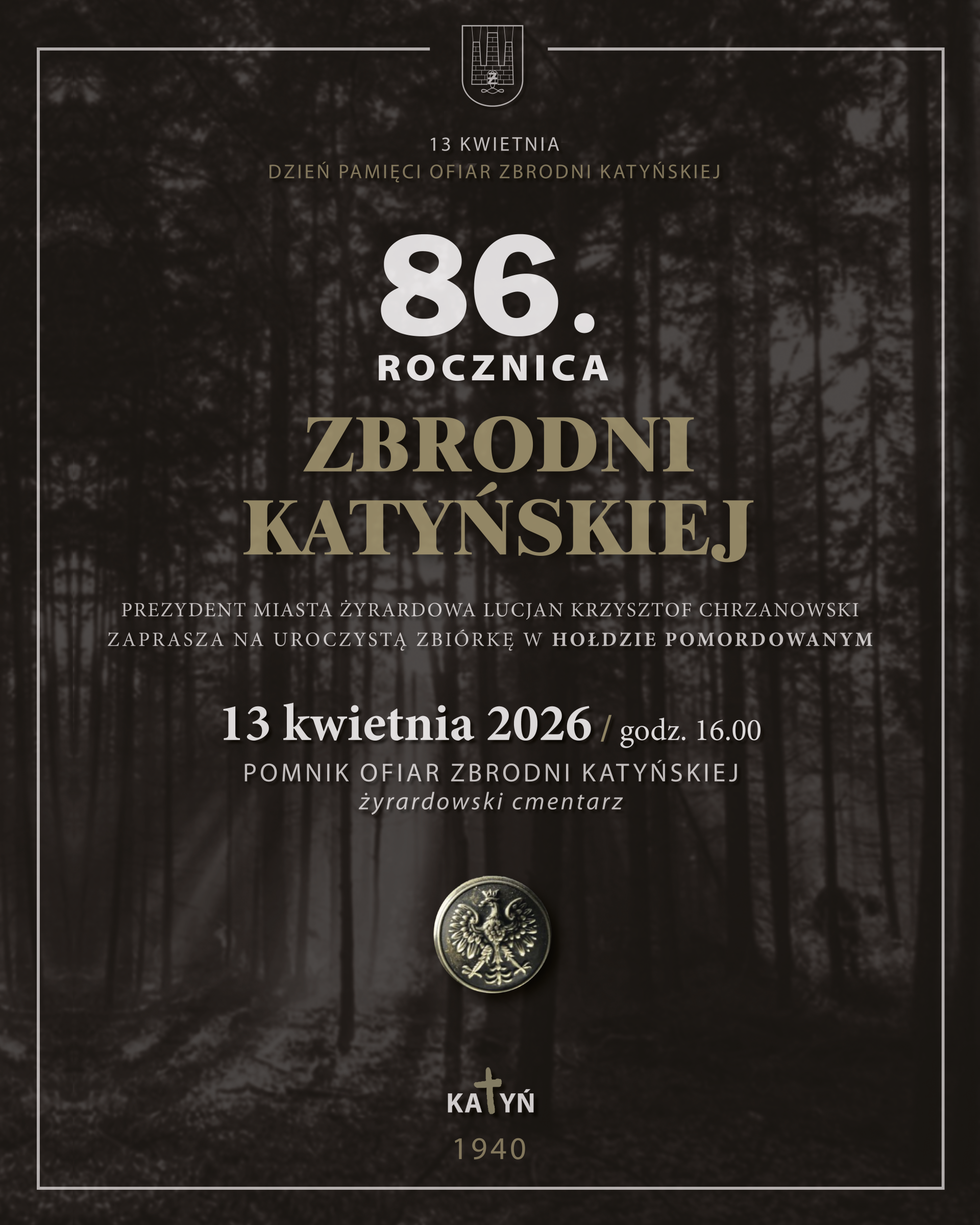 W Dzień Pamięci Ofiar Zbrodni Katyńskiej, 13 kwietnia, Prezydent Miasta Żyrardowa Lucjan Krzysztof Chrzanowski zaprasza na uroczystą zbiórkę, która odbędzie się o godz. 16.00, przy Pomniku Ofiar Zbrodni Katyńskiej na terenie żyrardowskiego cmentarza.