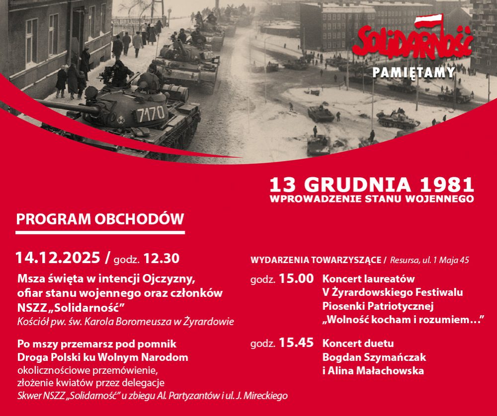 Prezydent Miasta Żyrardowa, Rada Miasta Żyrardowa oraz organizatorzy uroczystości zapraszają mieszkańców do udziału w obchodach 44. rocznicy wprowadzenia stanu wojennego, które odbędą się 14 grudnia 2025 roku.