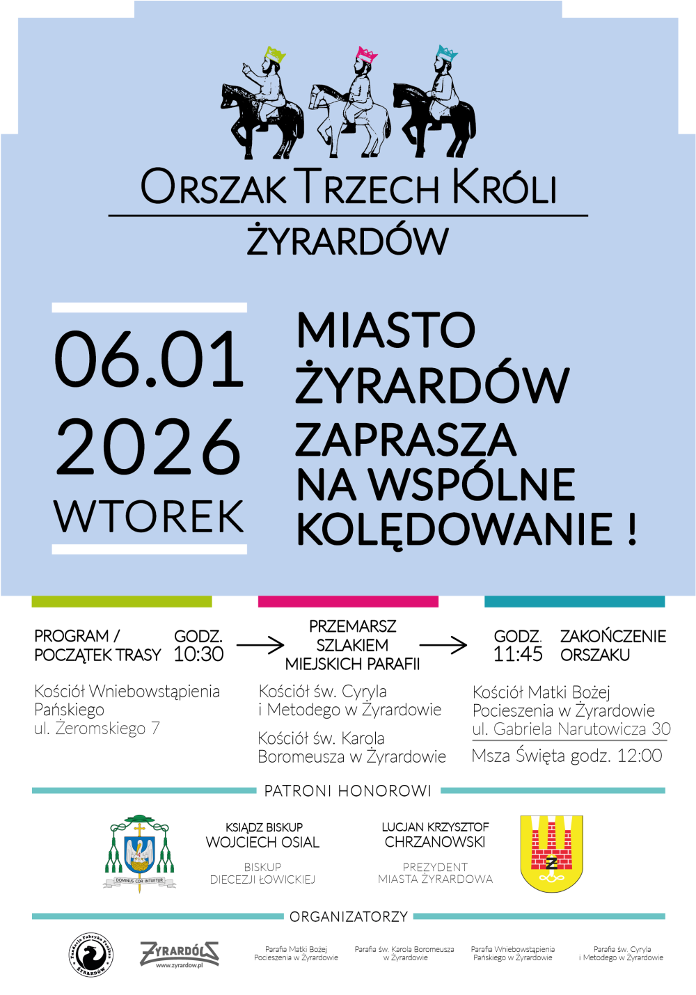 Jak co roku, w Uroczystość Objawienia Pańskiego, ulicami Żyrardowa po raz siódmy przejdzie barwny Orszak Trzech Króli. To już stała noworoczna tradycja, która co roku gromadzi tysiące mieszkańców we wspólnym, radosnym kolędowaniu. Żyrardowski przemarsz wystartuje 6 stycznia (wtorek) o godzinie 10:30 z Kościoła Wniebowstąpienia Pańskiego przy ulicy Żeromskiego 7.