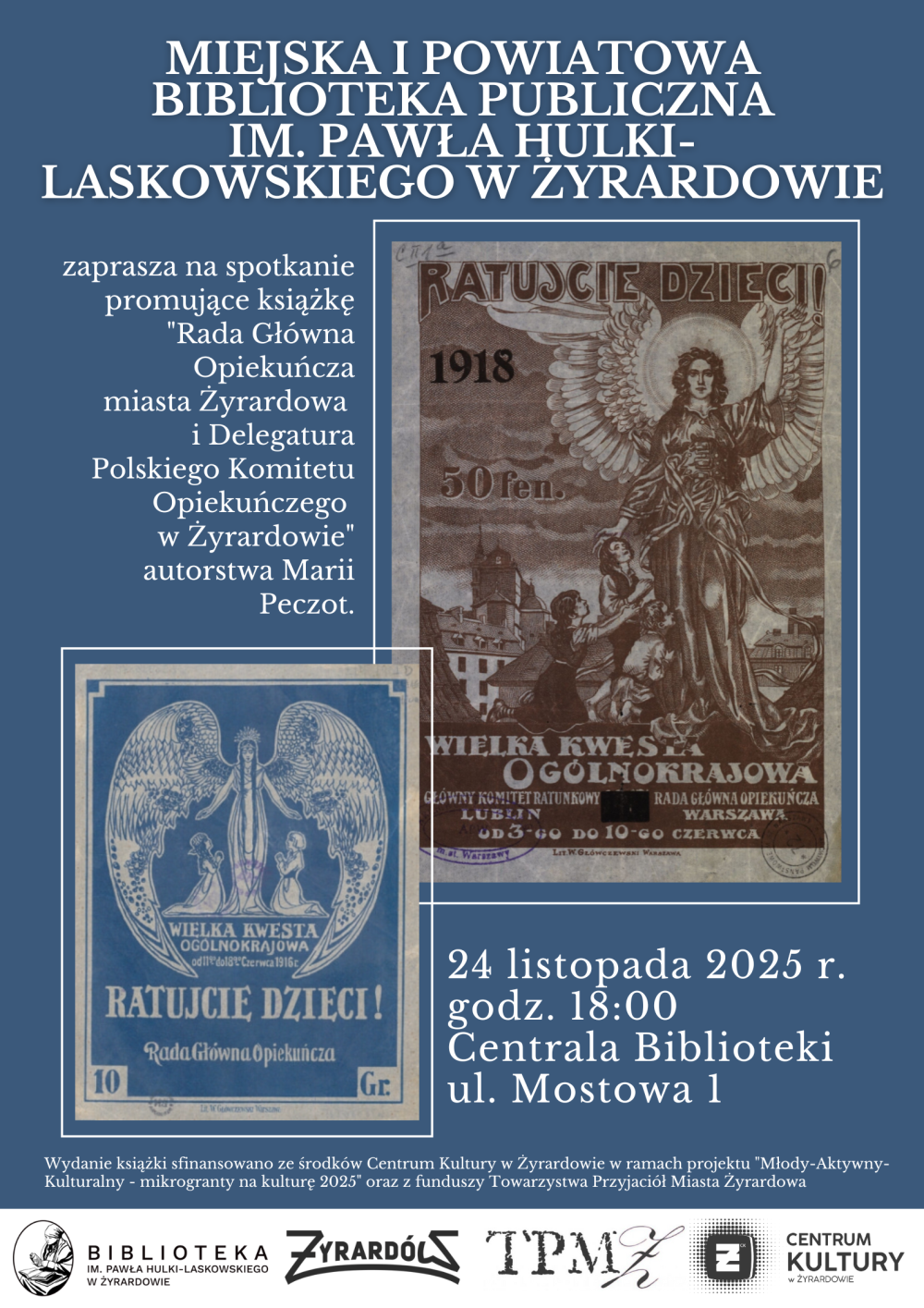 Miejska i Powiatowa Biblioteka Publiczna im. Pawła Hulki-Laskowskiego w Żyrardowie zaprasza na spotkanie promujące książkę „Rada Główna Opiekuńcza miasta Żyrardowa i Delegatura Polskiego Komitetu Opiekuńczego w Żyrardowie” autorstwa Marii Peczot.