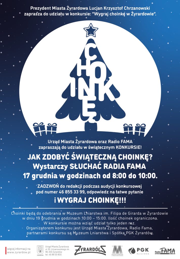 Zbliżające się Święta Bożego Narodzenia to czas radości, spotkań i przygotowań do wspólnego świętowania. Z tej okazji Prezydent Miasta Żyrardowa Lucjan Krzysztof Chrzanowski, Urząd Miasta Żyrardowa oraz Radio FAMA zapraszają mieszkańców do udziału w świątecznym konkursie „Wygraj choinkę w Żyrardowie”.