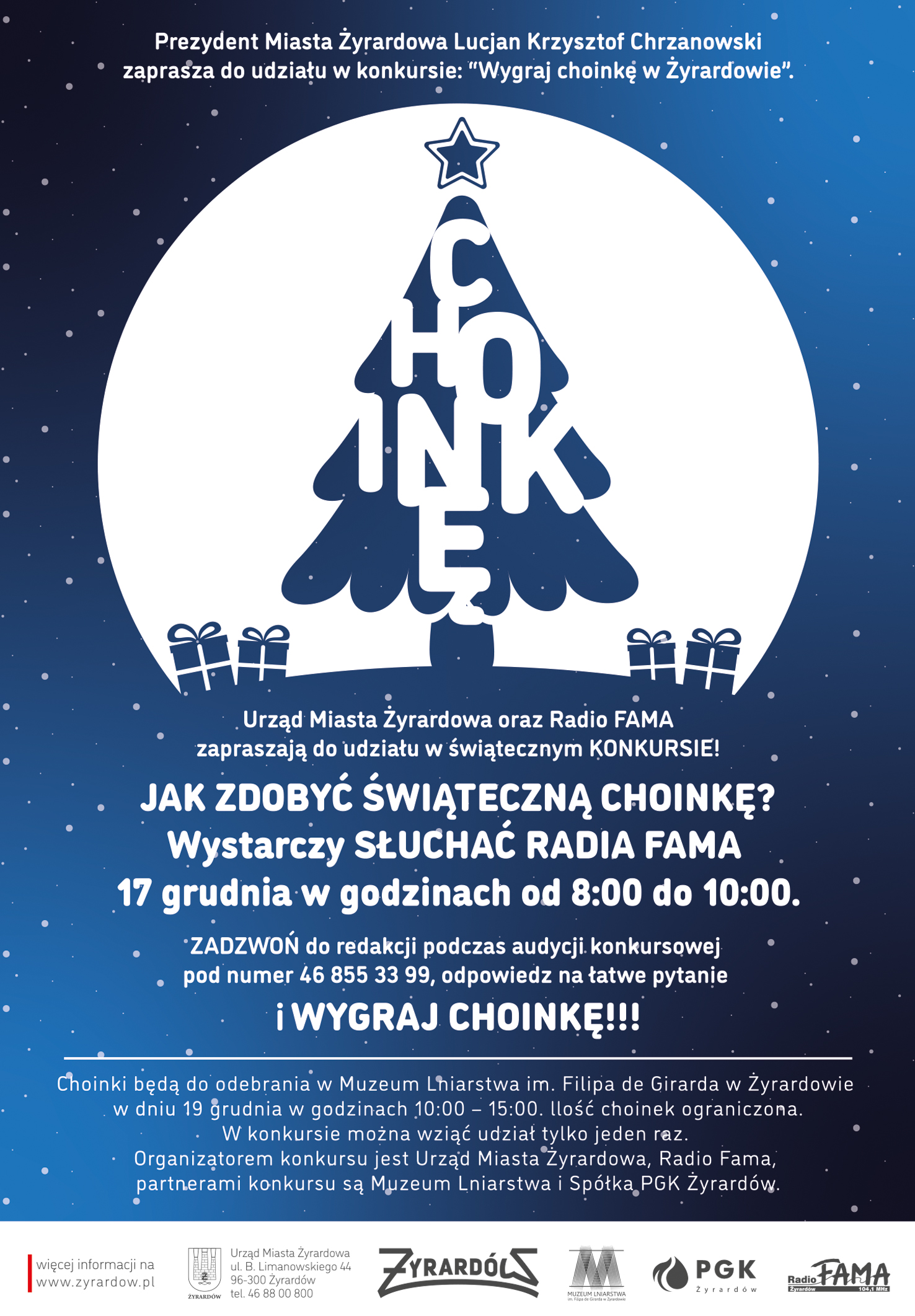 Zbliżające się Święta Bożego Narodzenia to czas radości, spotkań i przygotowań do wspólnego świętowania. Z tej okazji Prezydent Miasta Żyrardowa Lucjan Krzysztof Chrzanowski, Urząd Miasta Żyrardowa oraz Radio FAMA zapraszają mieszkańców do udziału w świątecznym konkursie „Wygraj choinkę w Żyrardowie”.