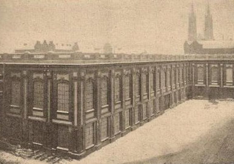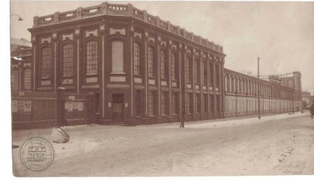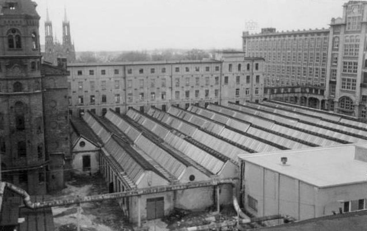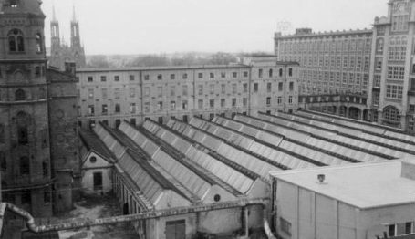 The first building from the gate, in the shape of an elongated rectangle, is a fabric inspection room built before 1885. The next one is a large-scale fabric preparation hall from 1929, with a characteristic tiered roof, allowing the installation of windows to light the hall. Originally, the hall was adjacent to the Old Spinning Mill. Behind it, a re-rendered fabric warehouse building. On the other side, a five-story building with a turret, is an added wing of the Old Spinning Mill, later the Onion Weaving Mill.