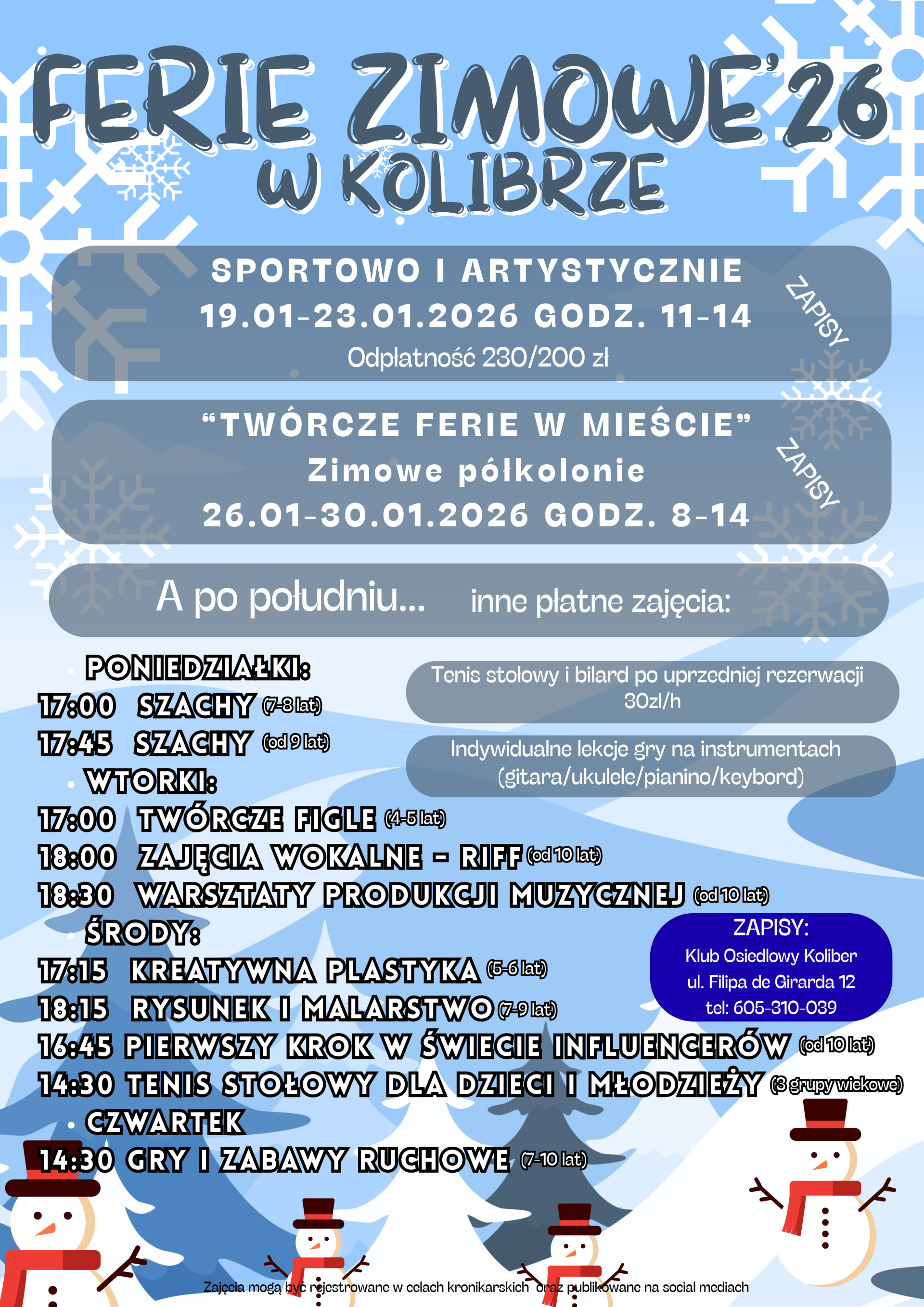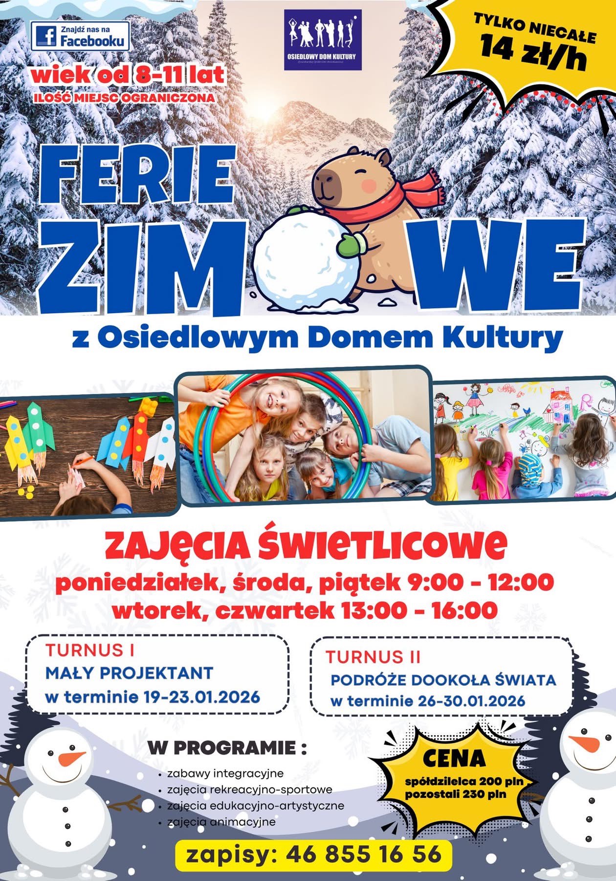 Mnóstwo atrakcji dla dzieci i młodzieży na czas ferii przygotowały placówki kulturalne, sportowe czy opiekuńczo – wychowawcze. Codziennie dziać się tam będzie coś ciekawego. Nie możecie tego przegapić! Dla ułatwienia zebraliśmy oferty poszczególnych placówek w jednym miejscu. Zachęcamy do zapoznania się z propozycjami! Pamiętajmy, że liczba miejsc jest ograniczona, a na większość zajęć obowiązują zapisy! Prosimy o kontakt bezpośrednio z organizatorami.